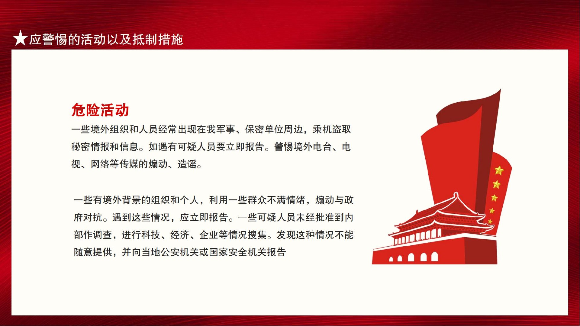 居安而念危,則終不危;操治而慮亂,則終不亂。通過全民國家安全教育日的一系列活動,可以讓政府和社會公眾有效地了解國家安全法提出的各項要求,從而強(qiáng)化責(zé)任意識,提高大家維護(hù)國家安全的能力。